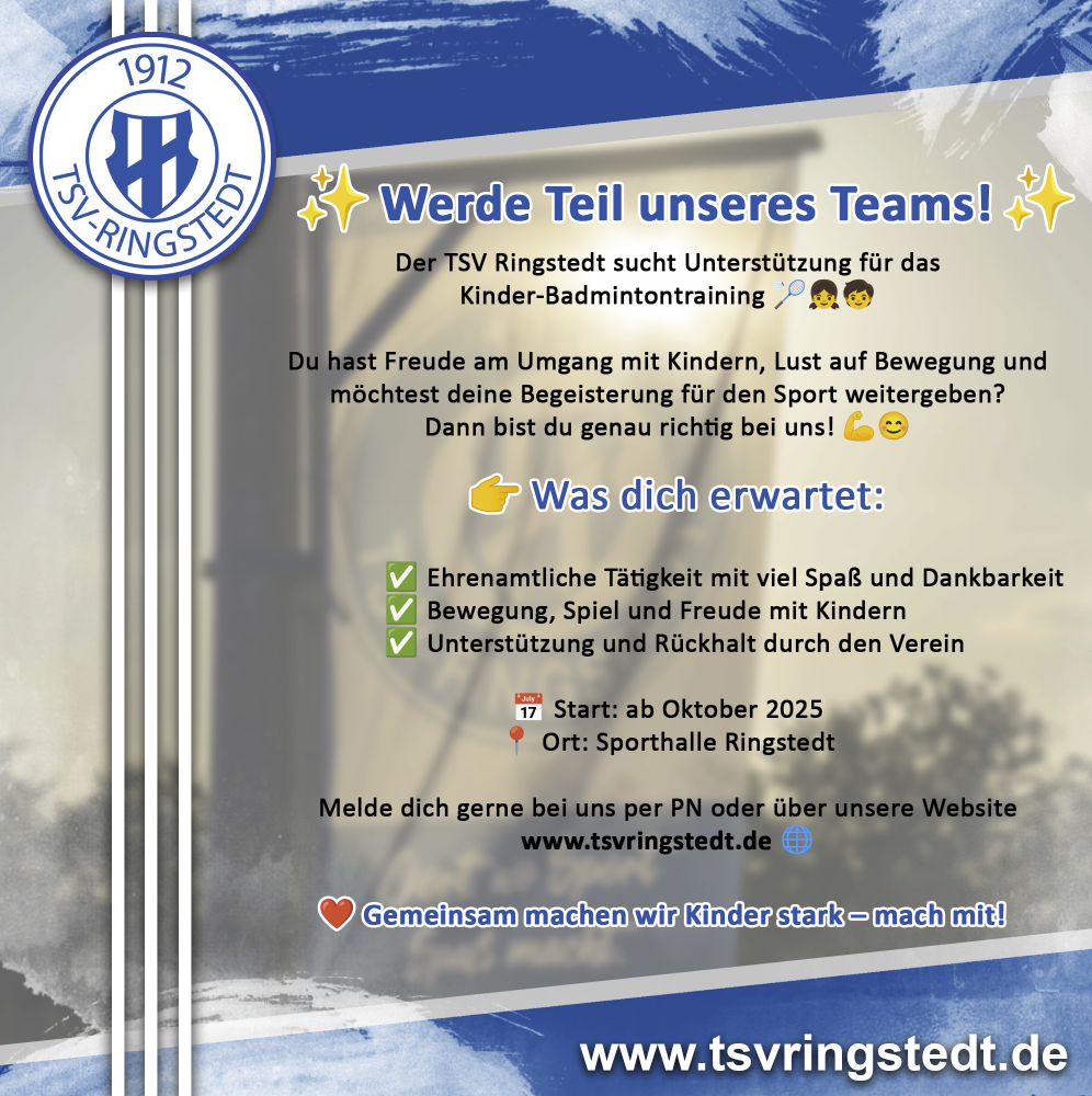 Der TSV Ringstedt sucht Unterstützung für das Kinder-Badmintontraining 🏸👧🧒